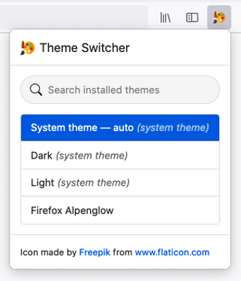 Theme Switcher สำหรับ Firefox เป็นส่วนขยายฟรีที่ออกแบบมาเพื่อเพิ่มความเป็นส่วนตัวในการท่องเว็บของคุณ เครื่องมือนี้ให้ผู้ใช้มีทางลัดไอคอนที่สะดวกซึ่งตั้งอยู่ในแถบเครื่องมือของเบราว์เซอร์ ทำให้กระบวนการเปลี่ยนระหว่างธีมที่ติดตั้งอยู่สะดวกยิ่งขึ้น เพียงแค่คลิกเดียว ป๊อปอัปที่ใช้งานง่ายจะปรากฏขึ้น ทำให้สามารถเข้าถึงเมนูแบบเลื่อนลงของธีมที่มีอยู่ได้อย่างรวดเร็ว